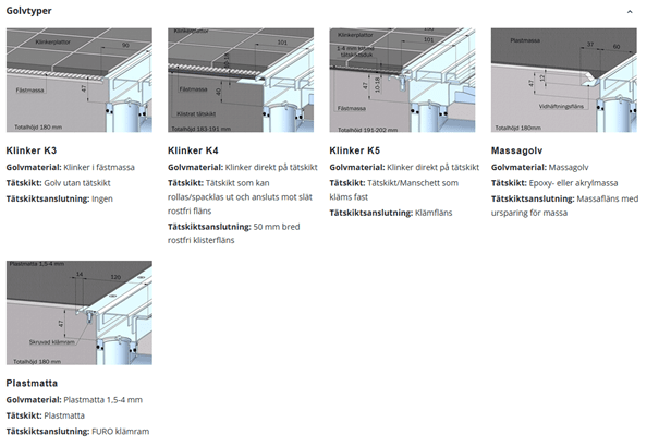 - Rännan är anpassad för ingjutning i betonggolv. Överdelar finns anpassade för olika golvtyper som klinkergolv, massagolv, plastmatta samt stålslipat betonggolv.