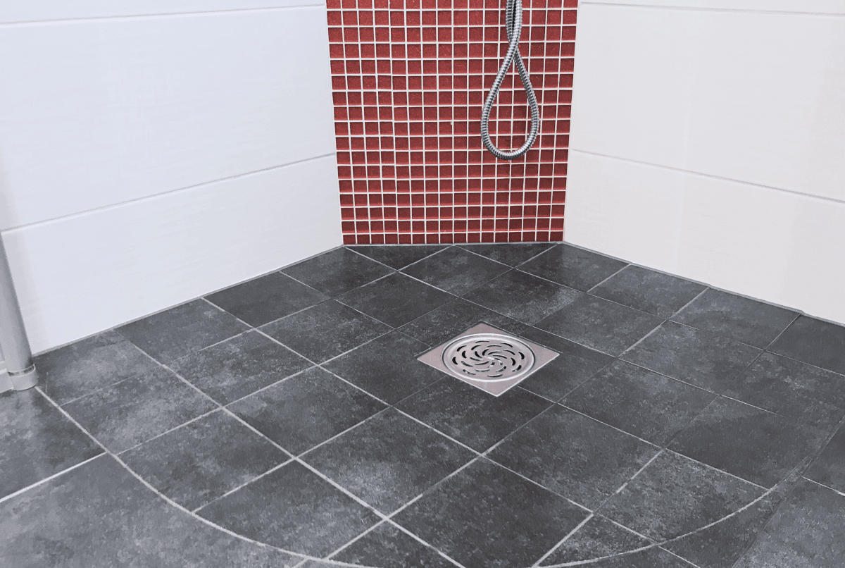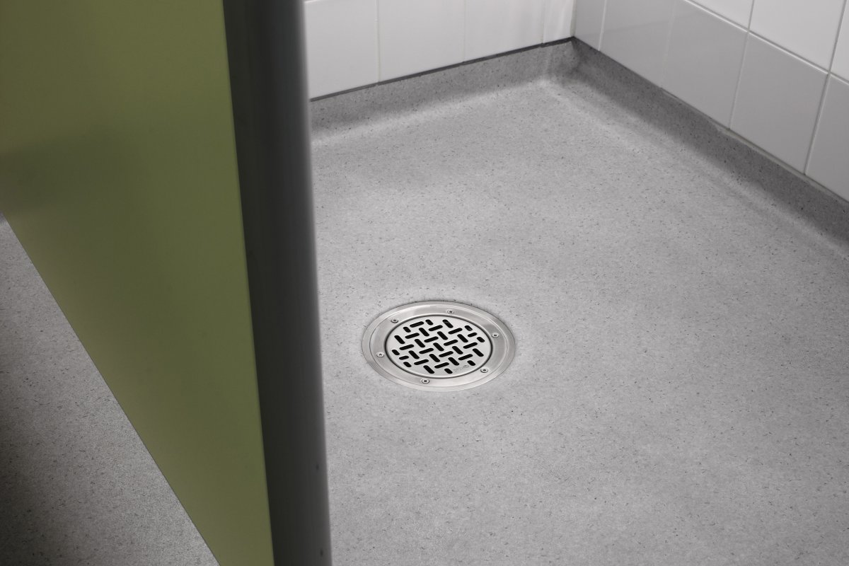 Liten rostfri golvbrunn idealisk för våtutrymmen i offentliga miljöer som duschar och omklädningsrum. Finns på lager för snabb leverans.