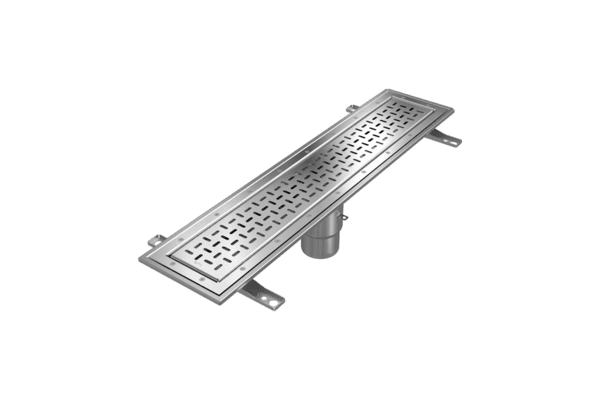 Funktionell och barfotavänlig rostfri golvränna för offentlig miljö. Idealisk för bad, spa, gym och andra offentliga dusch- och omklädningsrum.