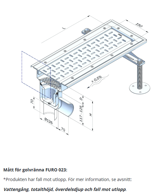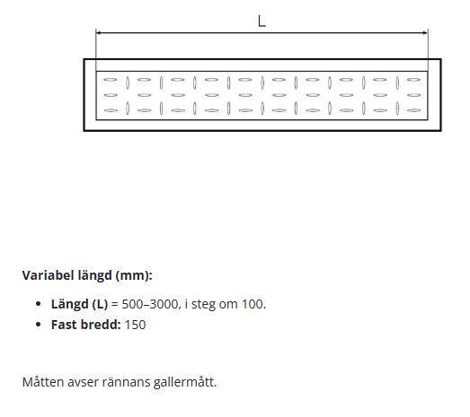 - Vid en längd på 3000 mm och ett djup på 56/36 mm erhålls ett fall på 0,7 % mot utloppet vid mittplacerat utlopp.