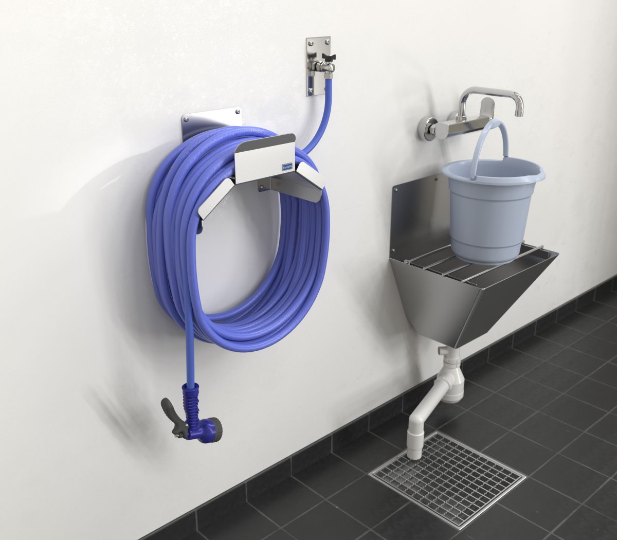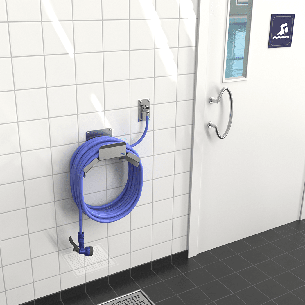 Ska slanghyllan monteras utomhus eller i korrosiva miljöer som badhus rekommenderar vi val av material syrafast rostfritt stål EN 1.4404 (SS 2348).