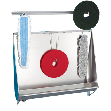 - Försedd med krokar i överkant för moppgarn samt en löstagbar upphängningsbygel för städmaskinsrondeller (observera att moppgarn och städrondeller inte ingår).