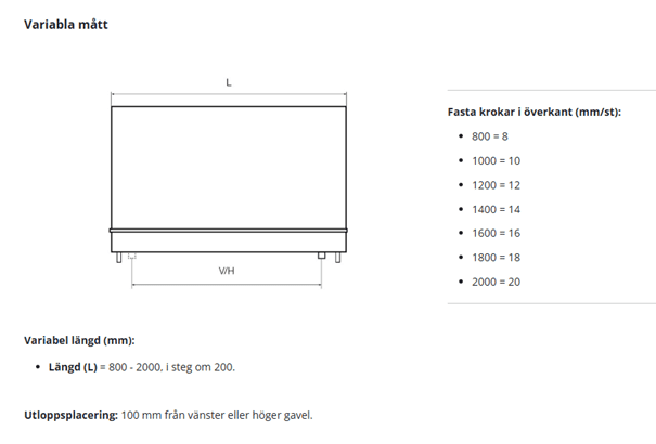 Utloppsplacering: 100 mm från höger/vänster gavel
