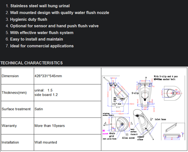 Urinalen lämpar sig särskilt väl för restauranger, flygplatser, terminaler, krogar, marin miljöer samt alla platser med höga hygienkrav. Tack vare sin väggmonterade design och rostfria konstruktion är den idealisk i utrymmen där många människor passerar, såsom sportarenor, skolor, köpcentrum, rastplatser och resecentrum mm