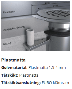 - Plastmatta på träbjälklag: 42 mm – (D) mäts till tätskiktsnivå