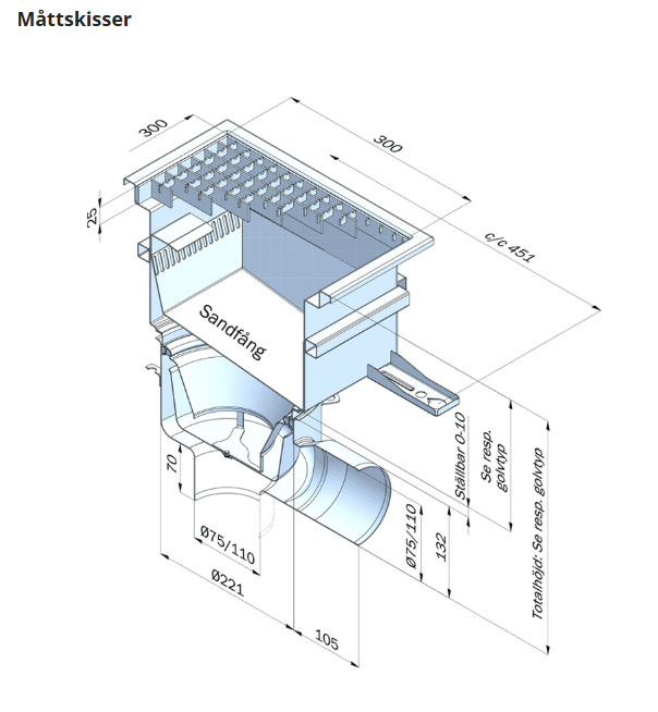 För att underlätta produktvalet anger vi totalhöjden (H) på våra brunnar och rännor. Totalhöjden är avståndet från färdig golvyta ner till där vattnet lämnar produkten. Vid bottenutlopp räknas mätpunkten där stosen börjar.