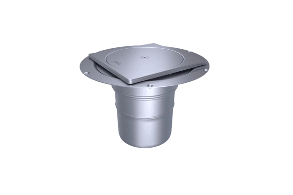Rostfri rensbrunn/spolbrunn för ingjutning i betonggolv. Rensbrunnen möjliggör enkel spolning av avloppsrör från markytan där sand, grus och sediment som kommer in i avloppsrören kan enkelt spolas bort vid behov.