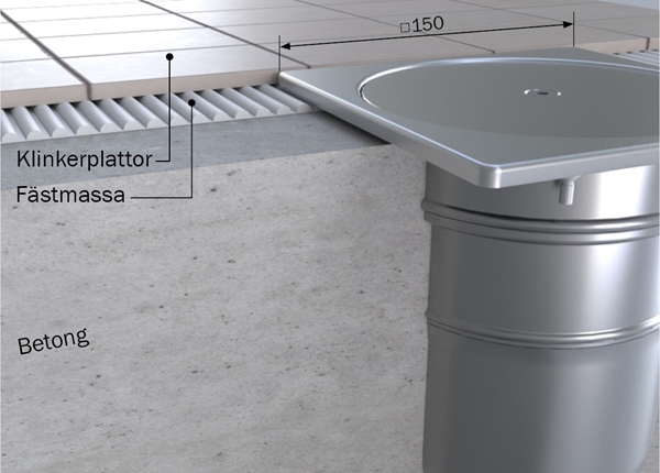 Rens- och spolbrunn av rostfritt stål för ingjutning i betonggolv