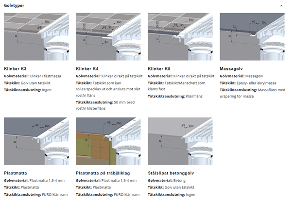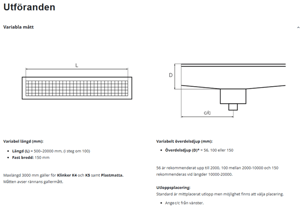 Vid längder upp till 2000 mm och rekommenderat djup på 56/36 mm blir fall mot utlopp minst 1 % .Vid längder mellan 2000 – 10 000 mm och rekommenderat djup på 100/80 mm blir fall mot utlopp minst 1 % .Vid längder mellan 10 000 – 20 000 mm och rekommenderat djup på 150/130 mm blir fall mot utlopp minst 1 % .