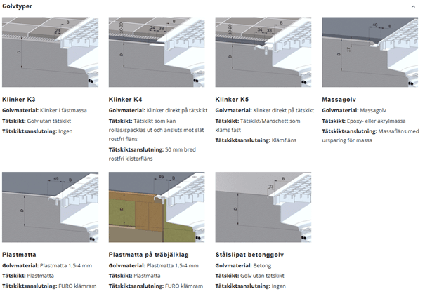 • För golvtypen klinkers K4 och K5 varierar överdelsdjupet (D) mellan 50, 80, 130 och 180 mm (80 mm är standard för längder upp till 2000 mm).