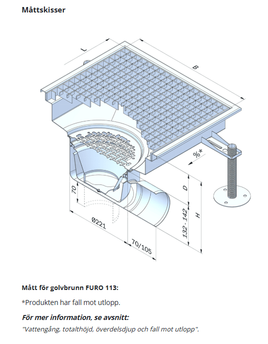 Produktens fall mot utlopp varierar beroende på längd och valt överdelsdjup (D). Vid standardutförande med mittplacerat utlopp gäller följande rekommendationer: