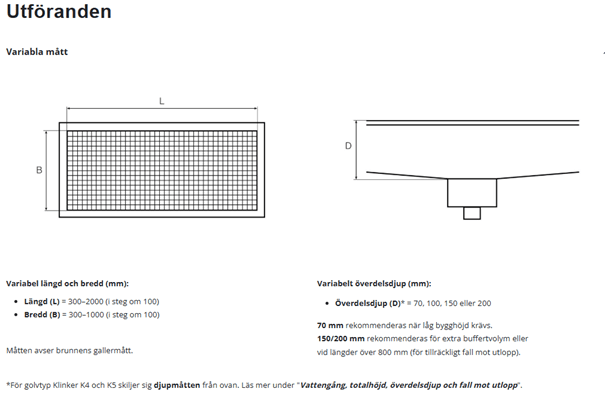 VARIABELT ÖVERDELSDJUP (D)* = 70, 100, 150 eller 200. 70 mm rekommenderas när låg bygghöjd krävs. 150/200 mm rekommenderas för extra buffertvolym eller vid längder över 800 mm (för tillräckligt fall mot utlopp). OBS ! ANGIVET PRODUKTPRIS ÄR FÖR ÖVERDELSDJUP 70MM