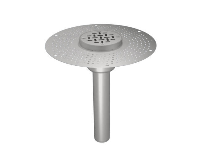 - Anpassad för utomhusbjälklag med frysrisk – Perfekt för terrasser, garage och innergårdar med frysrisk där traditionella golvbrunnar med vattenlås inte kan användas. Vid nederbörd fungerar brunnen som ett takavlopp, medan den vid installation under tak används som en golvbrunn utan vattenlås.