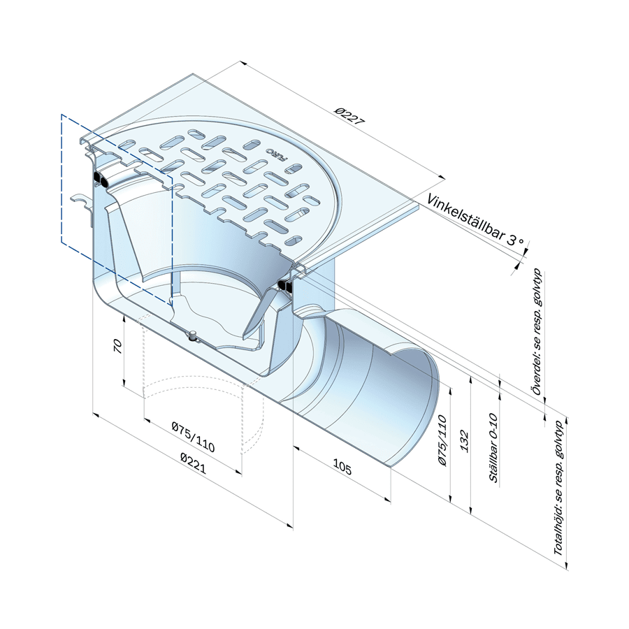 För att underlätta produktvalet anger vi totalhöjden (H) på våra brunnar och rännor. Totalhöjden är avståndet från färdig golvyta ner till där vattnet lämnar produkten. Vid bottenutlopp räknas mätpunkten där stosen börjar.