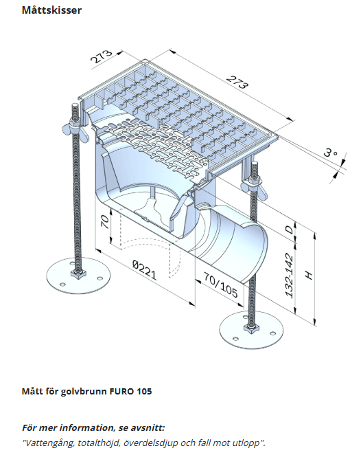 För att underlätta produktvalet anger vi totalhöjden (H) på våra brunnar och rännor. Totalhöjden är avståndet från färdig golvyta ner till där vattnet lämnar produkten. Vid bottenutlopp räknas mätpunkten där stosen börjar.