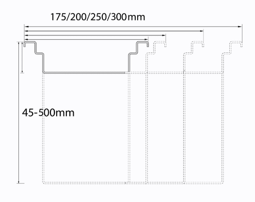 - Längd (enskild ränna) Max. 10 m, längre linjer tillverkas av flera rännor med tätningsflänsar