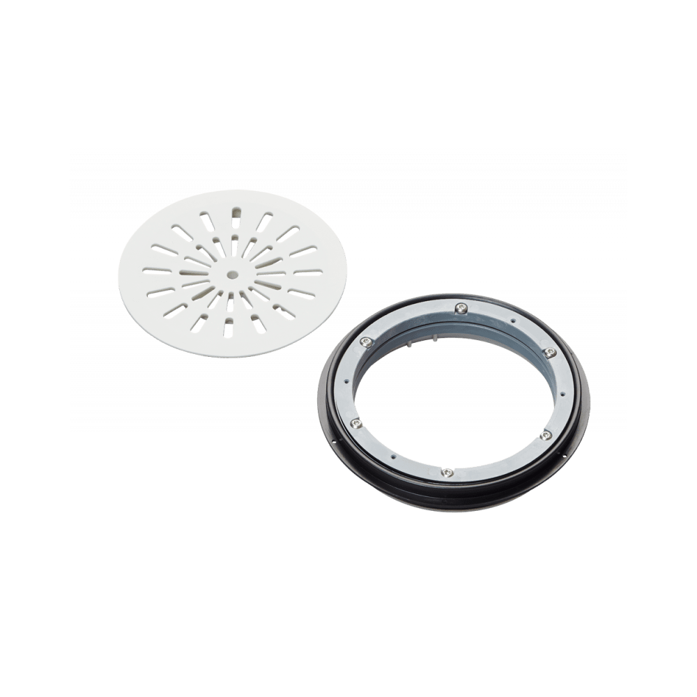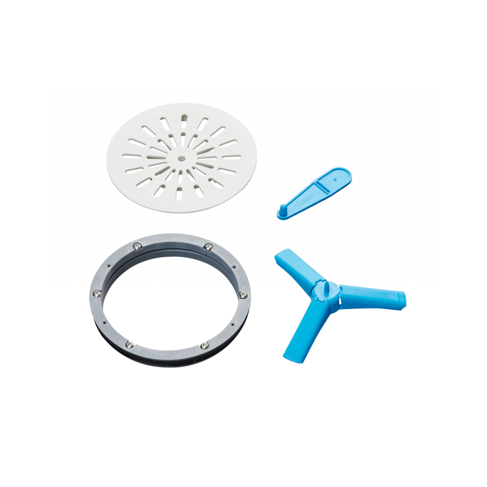 Förpackningen innehåller förhöjningsring, vit läpptätning, vit stödring samt skruvbar klämring, rund sil och skärmall för tätskikt.