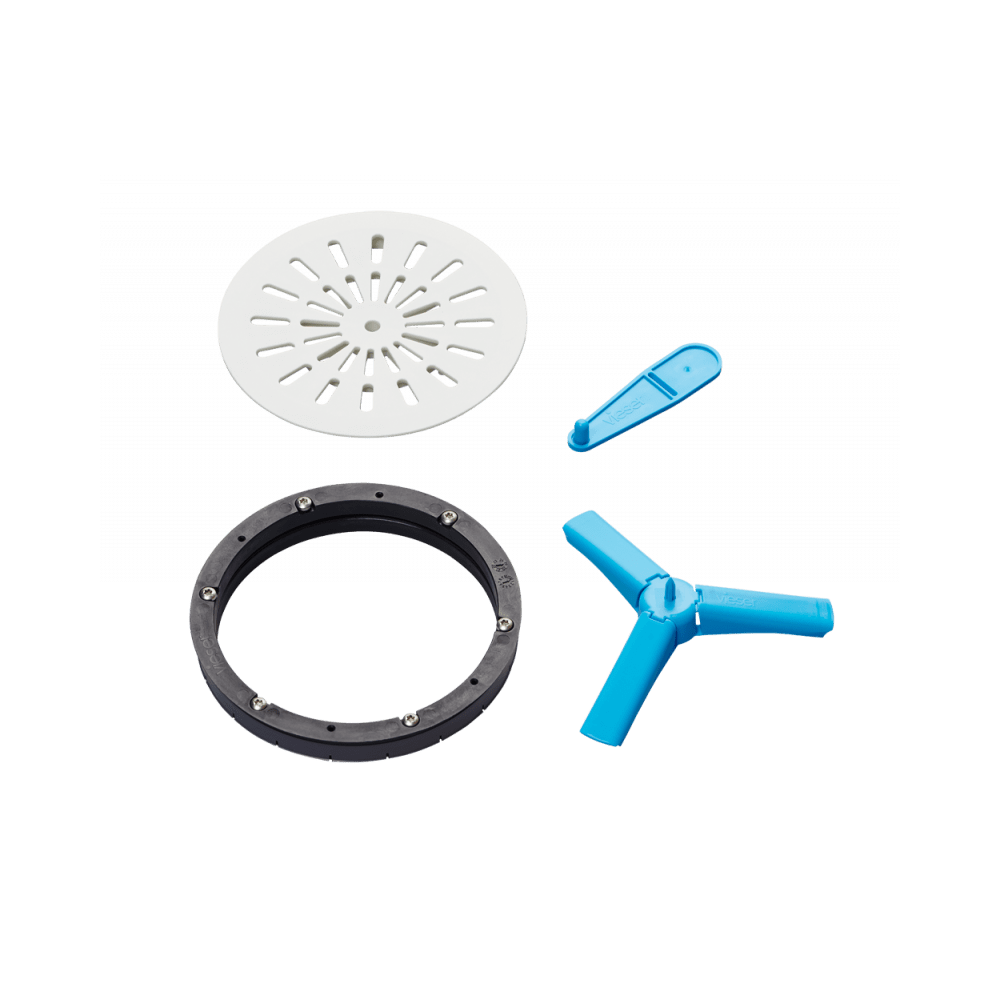 Förpackningen innehåller golvbrunn, vattenlås, skyddslock, läpptätning samt skruvbar klämring, rund sil och skärmall för tätskikt.
