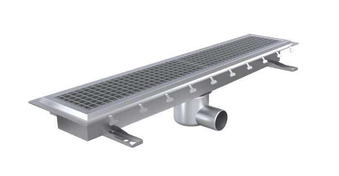 Robust golvränna i rostfritt stål med gallerbredd 150 mm. Idealisk för verkstäder, industrier och andra krävande miljöer med tung trafik. Golvrännan är anpassad för flera vanliga golvtyper och tillverkas i rostfritt stål EN 1.4301 (SS 2333) eller syrafast rostfritt stål EN 1.4404 (SS 2348) för maximal hållbarhet och korrosionsbeständighet.
