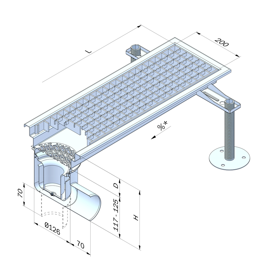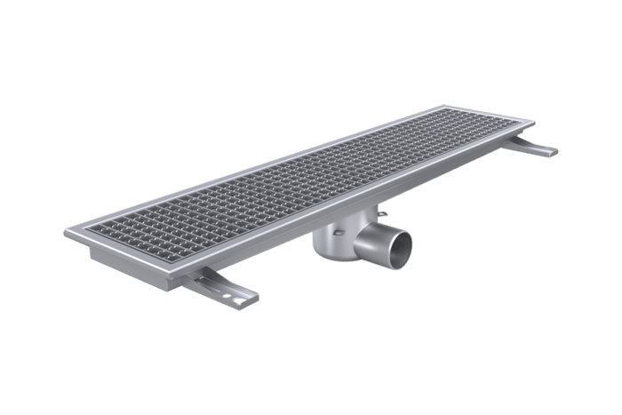- Rännan är utrustad med ett rostfritt halkskyddat galler i delar med en maxvikt på 6 kg per del, för ergonomisk hantering.