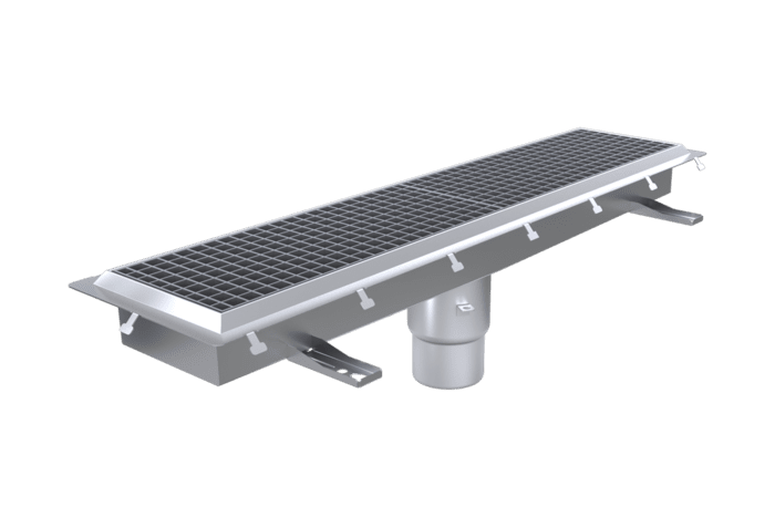 Robust golvränna i rostfritt stål med gallerbredd 200 mm. Idealisk för verkstäder, industrier och andra krävande miljöer med tung trafik. Golvrännan är anpassad för flera vanliga golvtyper och tillverkas i rostfritt stål EN 1.4301 (SS 2333) eller syrafast rostfritt stål EN 1.4404 (SS 2348) för maximal hållbarhet och korrosionsbeständighet.