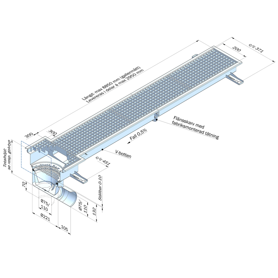 Installationstillbehör som ingår: Levereras täckt för att hindra betong från att rinna ner i rännan under gjutning. Rejäla fästöron för förankring i bjälklaget. Dessa ger möjlighet till enkel höjdjustering ovanifrån. Vid massagolv ingår ursparingslister på vidhäftningsflänsar.