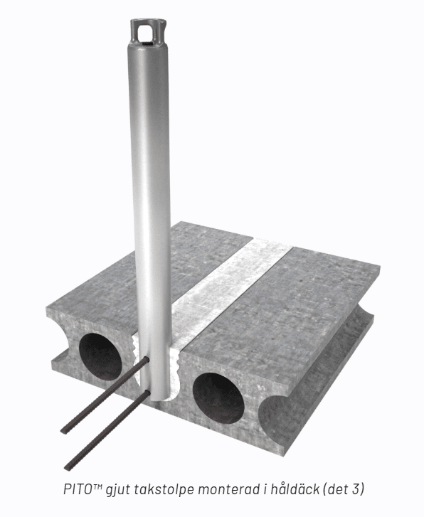PITO™-gjut takstolpe är utformad för de krävande förhållandena i Norden och är en särskilt stabil förankringspunkt för säkerhetslinor, hängställningar och andra hjälpmedel som behövs vid underhålls-, reparations- och räddningsarbeten på taket. Takstolpen lämpar sig för personligt fallskydd, både som en enskild förankringspunkt eller som en del av PITO™ Greenline vajersystemet. Takstolpen monteras genom gjutning i takets håldäck och garanterar säkra arbetsförhållanden för upp till fyra användare samtidigt.